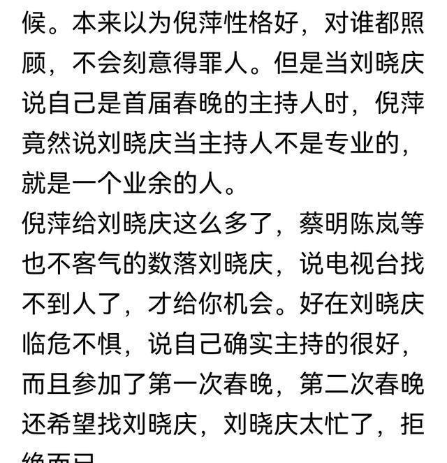 就比如她在《一路繁花》里三次怼刘晓庆就让人觉得很不适。 第一次,刘晓庆说自己是第一届春晚的主持人,蔡明说“你是业余的,不专业”,向太说“估计是电视台找不到人了”,随后和李小冉会心一笑。本来在这里倪萍应该站在刘晓庆一边,毕竟她也是主持人,而且是刘晓庆的晚辈主持人,没想到她却跟着她们一起嘲笑,“你那个不专业,是客串的”,说实话,倪萍这样说很过分,太毒舌,无论怎样你没有资格嘲讽刘晓庆,在中国电视刚起步的时候,所有人完全没有参考没有经验,而且是现场直播,刘晓庆勇挑重担,落落大方的完成主持任务,真的了不起,为以后的主持提供了模板,就像苹果16去嘲笑苹果一代机,你没有资格,更不应该!